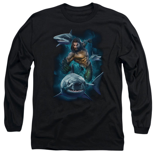 Aquaman Movie Swimming With Sharks Mens Long Sleeve Shirt Black Officially Licensed