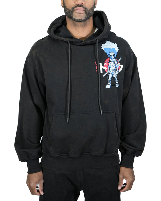 The Boondocks Huey Samurai Warrior Oversized Black Acid Wash Mens Hoodie