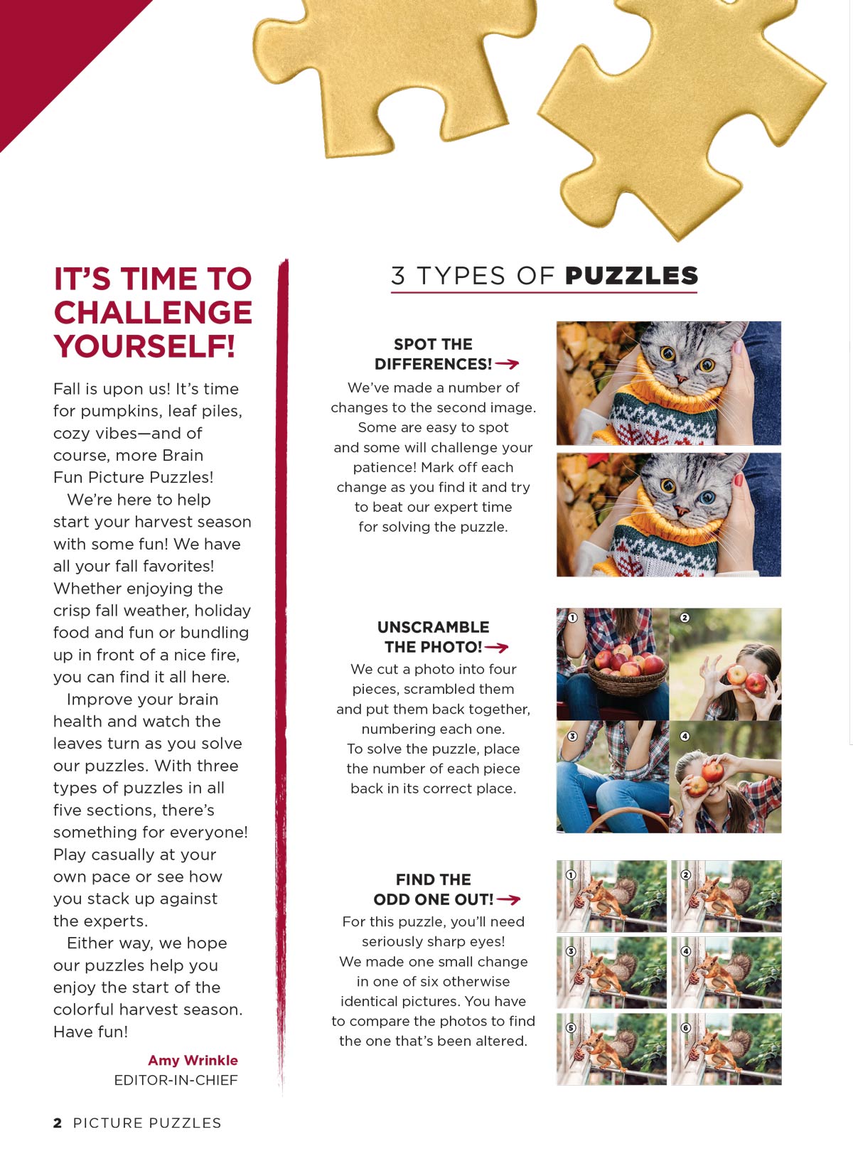 Welcome to the latest edition of Brain Fun Picture Puzzles! We’re glad you’re here to explore these colorful brainteasers. Studies show that puzzles like this help improve your memory and powers of concentration, and keep your brain sharp—plus, they’re tons of fun. Here, you’ll find five themed sections, each with all three puzzle types in varying skill levels. Challenge yourself or try to beat our experts’ times. Remember, the journey is just as rewarding as the destination!
