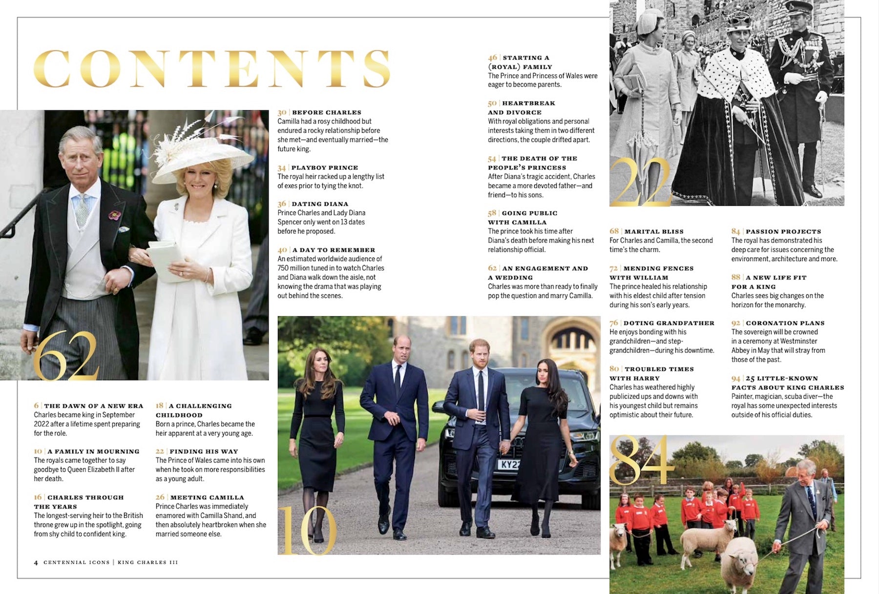 King Charles III took his place on the British throne in 2022, at the age of 73, after being the longest- serving heir apparent in the nation’s history. The royal became first in the line of succession in February 1952 at the age of 3 and honorably served his country for 70 years as he awaited his destiny. On Sept. 8, the day that his mother, Queen Elizabeth II, died at 96, Charles became the monarch of the United Kingdom. Biographer Penny Junor claimed in January 2022 that he was “dreading” his accession because it meant losing his beloved mother. In the years before her death, Queen Elizabeth slowed down, pass- ing some of her official duties to Charles and his son and heir, Prince William. Join us as we look at Charles through the years, and the years to come. This 100-page special is filled with wonderful photos, little known facts, and a glimpse into the future of the monarch.