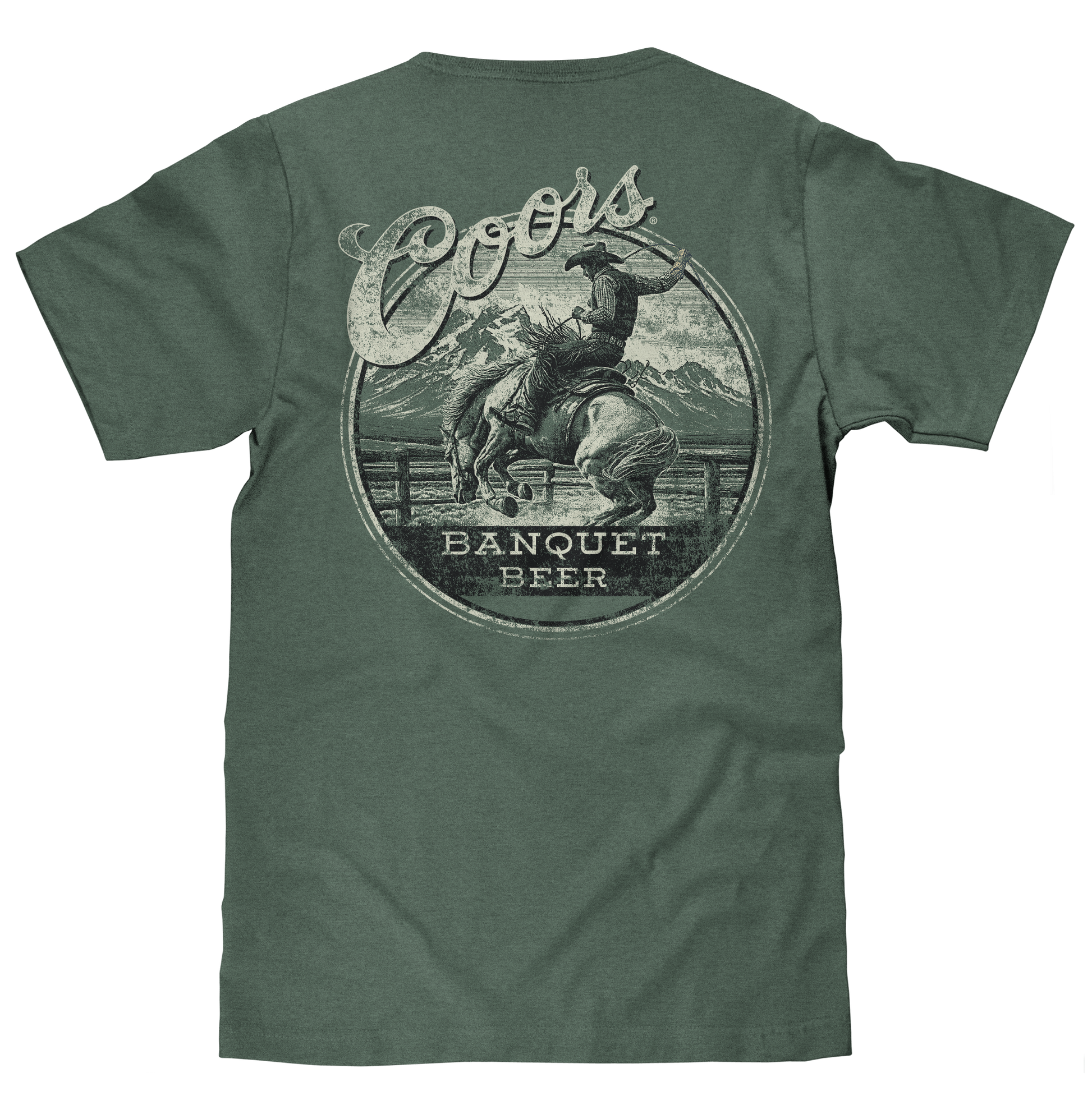 Founded in Golden, Colorado in 1873: The Coors brand doesn't just talk the talk - they've got the same pioneering and adventurous spirit as those daring cowboys that roamed the Rockies! To salute Coors and the trailblazers that shaped the American West - we've crafted a rugged but comfortable double sided beer t-shirt featuring the Coors logo on the front left chest. For the back, we've selected a rodeo inspired graphic of a cowboy riding a bucking bronco out in the corral. To complete the vintage look and feel of this Coors Banquet shirt - we've distressed the graphic and printed it on a soft, Cypress Green front pocket tee.