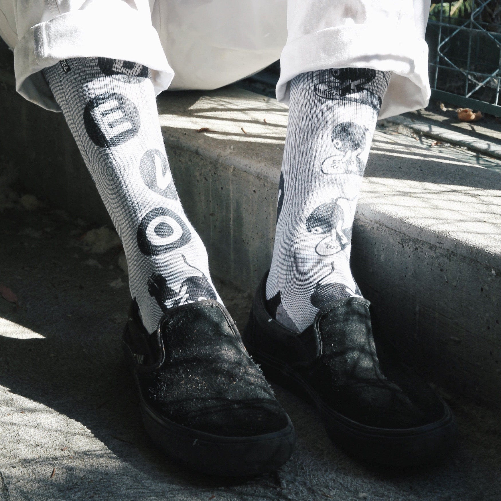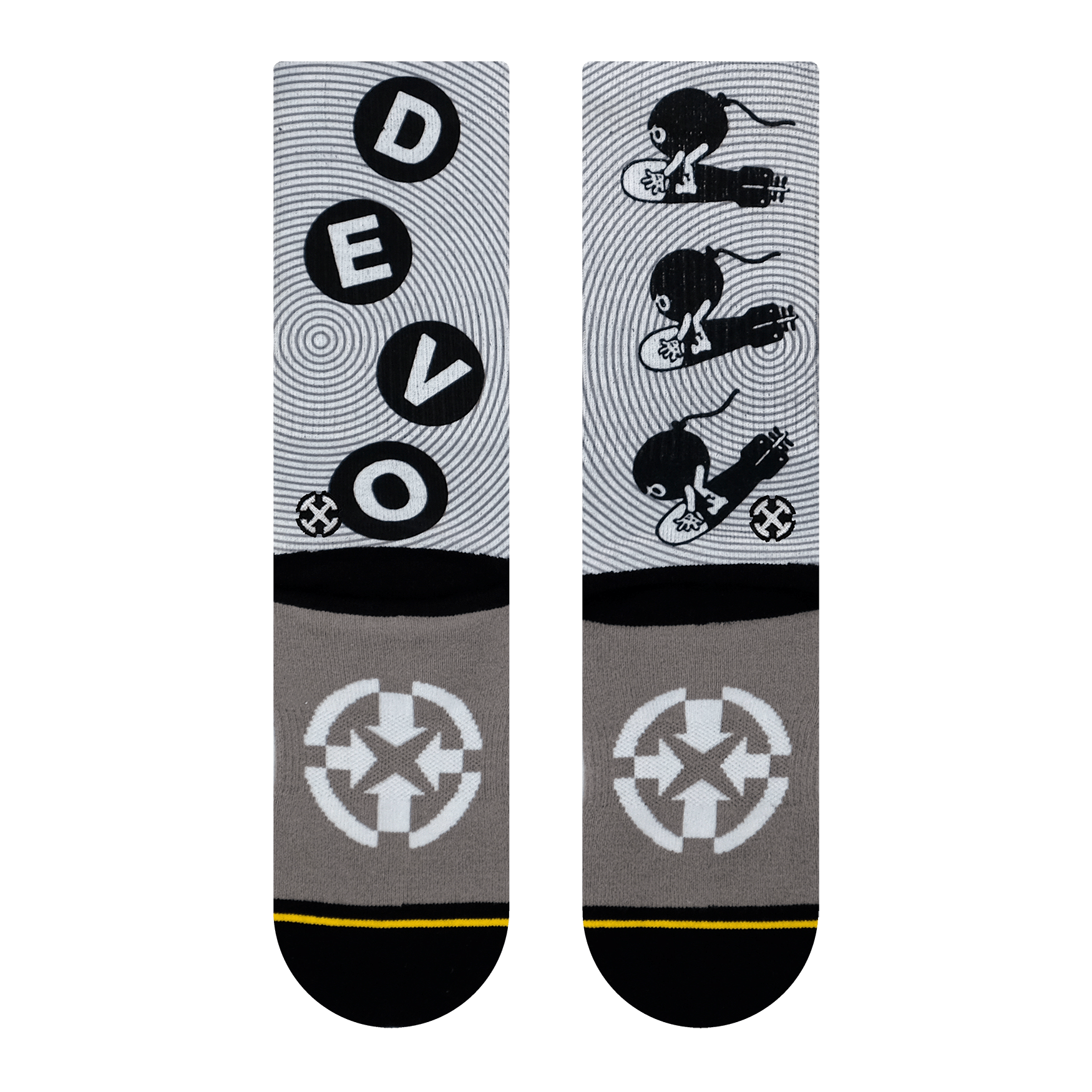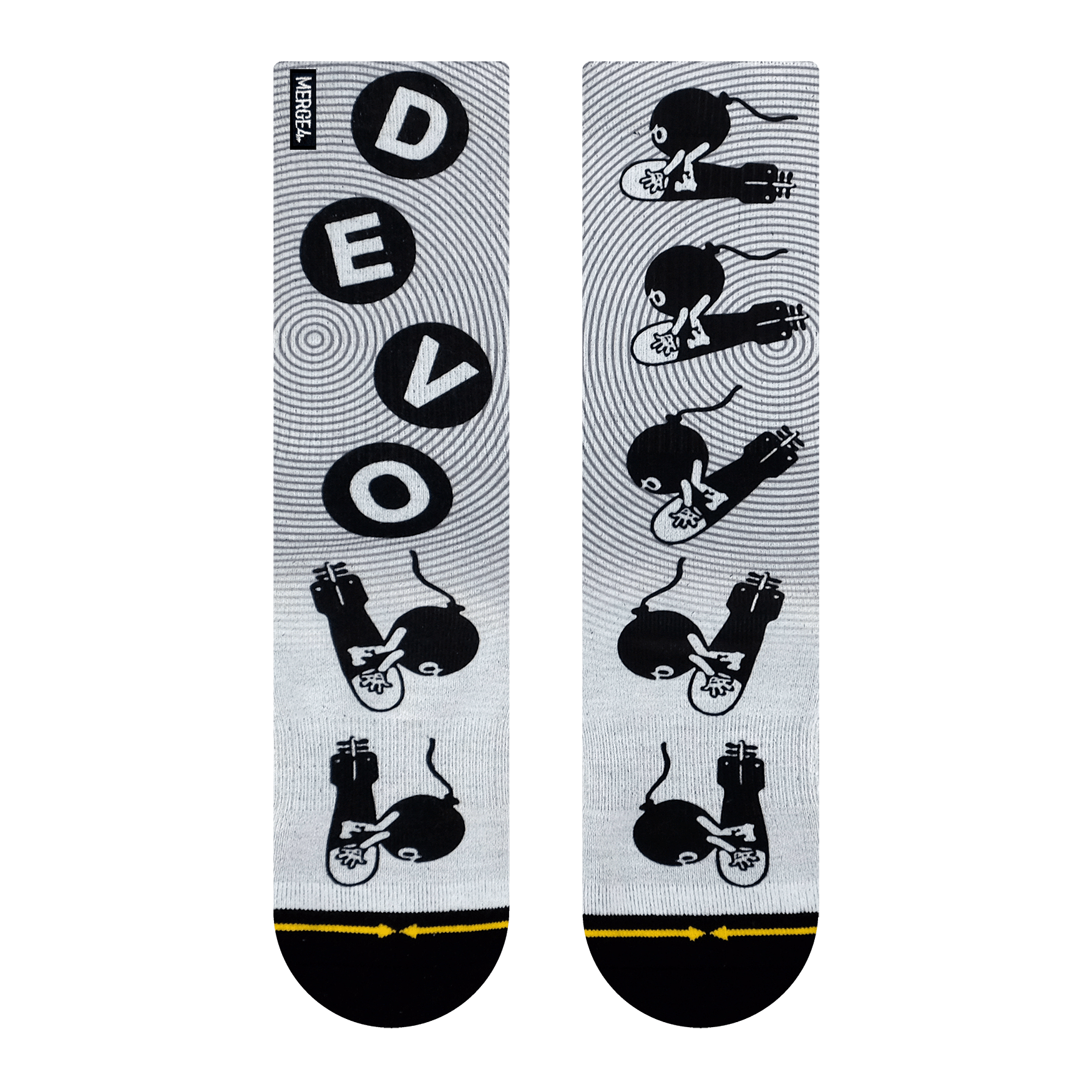 We are DEVO! Bombs Away, classic imagery from the iconic group. MERGE4 and DEVO team up to add another member to this superb collection of crew socks. Features a cult weave so graphics won't blow out and elastic arch support.