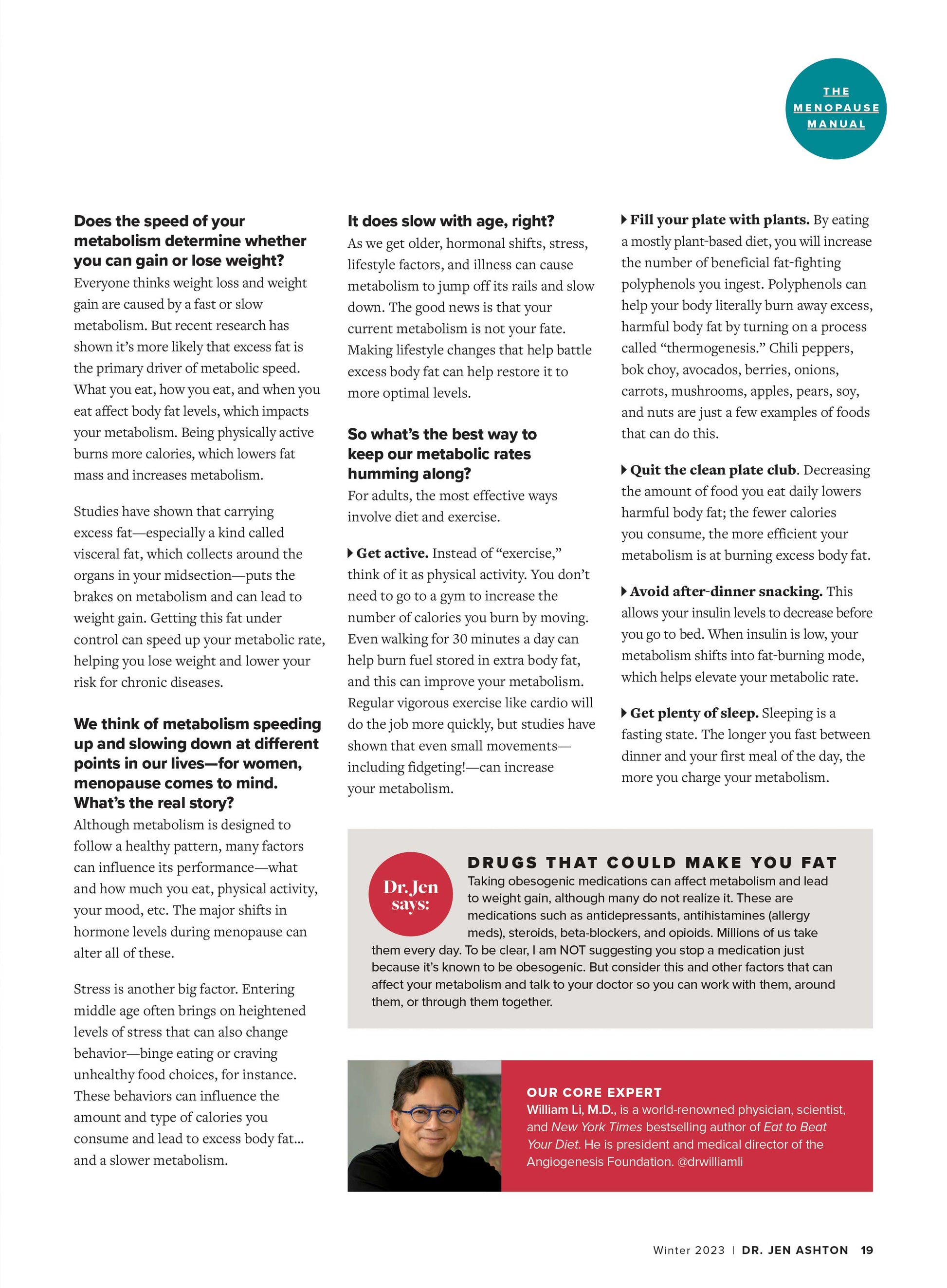 In this follow-up to her best-selling launch issue, Dr. Jen Ashton, Women’s Health Specialist, unveils a brand-new lineup of wellness information designed to help you move your health in the right direction. As a practicing OB-GYN, nutritionist, and board-certified obesity medicine specialist, she’s passionate about promoting optimal health for the “whole woman.” In this publication, Dr. Jen offers insights about how to thrive in menopause; how to achieve “authentic beauty,” why good sleep is essential to good health, and why we all need “a checkup from the neck up.” She opens up about what makes her happy, shares her personal eating plan that allows you to take “mini vacations,” and much more. Let Dr. Jen answer your health questions and help you feel your best…every day!