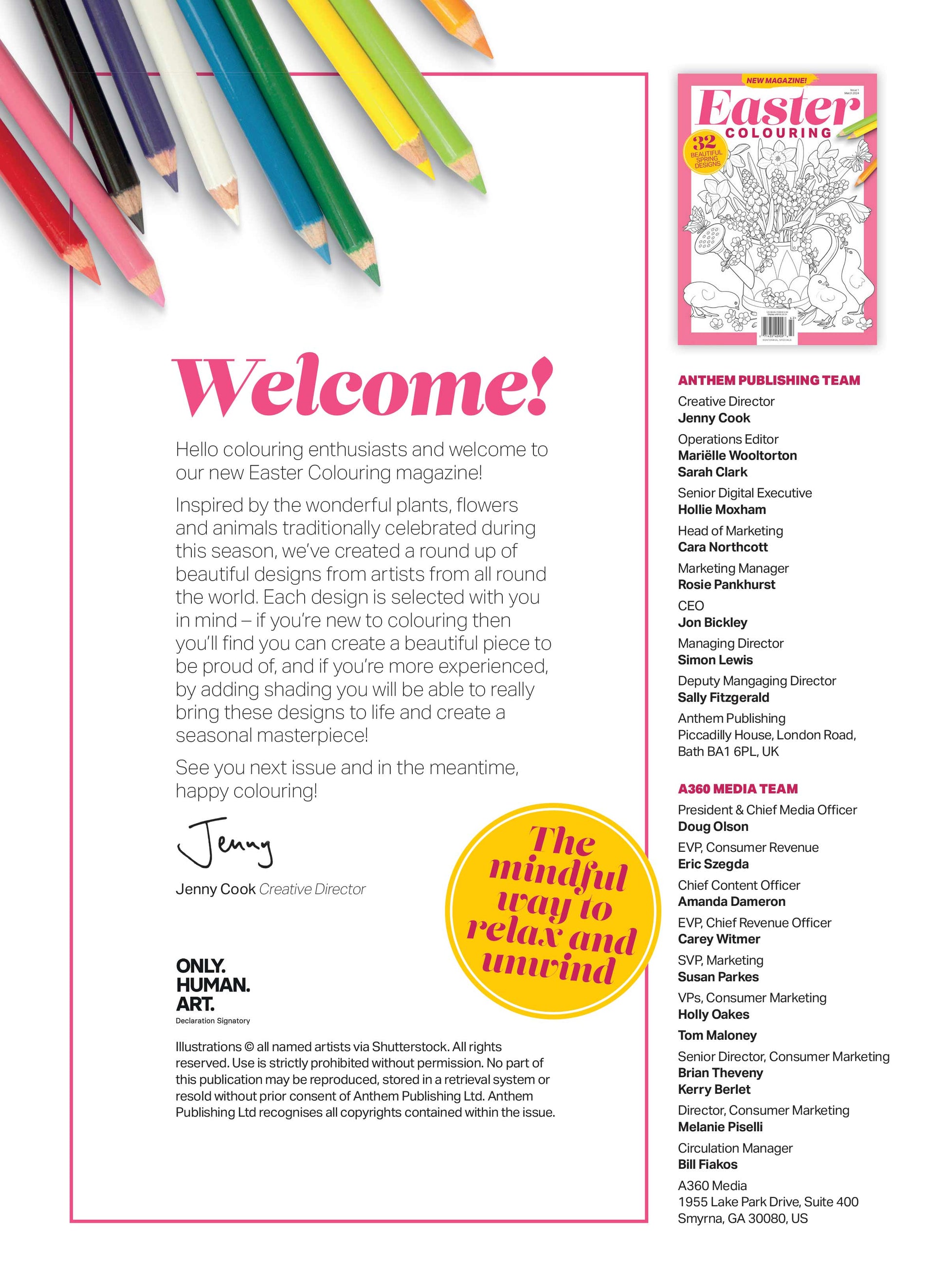 Hello colouring enthusiasts and welcome to our new Easter Colouring magazine! Inspired by the wonderful plants, flowers and animals traditionally celebrated during this season, we've created a round up of beautiful designs from artists from all around the world. Each design is selected with you in mind - if you're new to colouring then you'll find you can create a beautiful piece to be proud of, and if you're more experienced, by adding shading you will be able to really bring these designs to life and create a seasonal masterpiece!