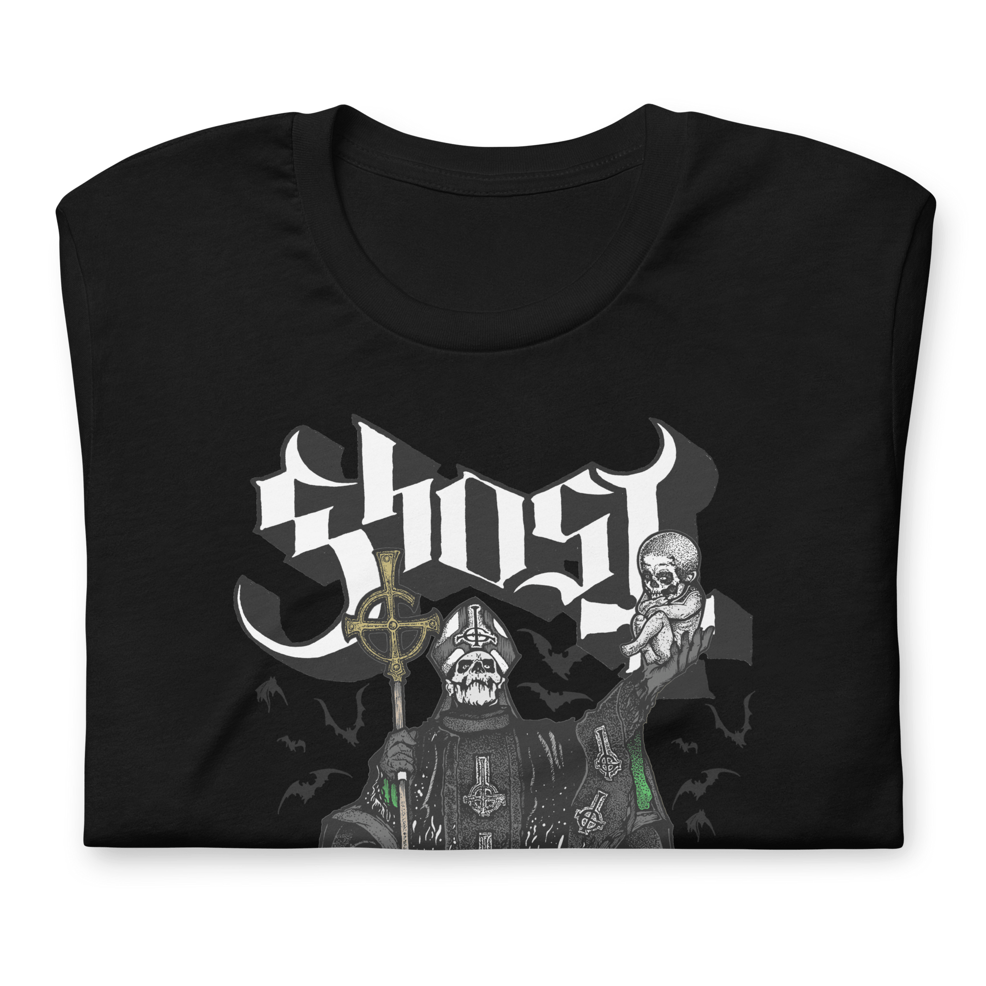 Step into the enigmatic realm of Ghost – the theatrical rock sensation that emerged in 2006, led by the mysterious Papa Emeritus. With hits like "Square Hammer" and "Rats," Ghost's occult-inspired music and mesmerizing performances have captivated a global audience. Experience the unique blend of melodic hooks and dark mystique that sets Ghost apart in the world of rock. Join the legion of fans enchanted by the mysterious allure of Ghost's sonic brilliance.Check out more of the best Ghost T-Shirts!
