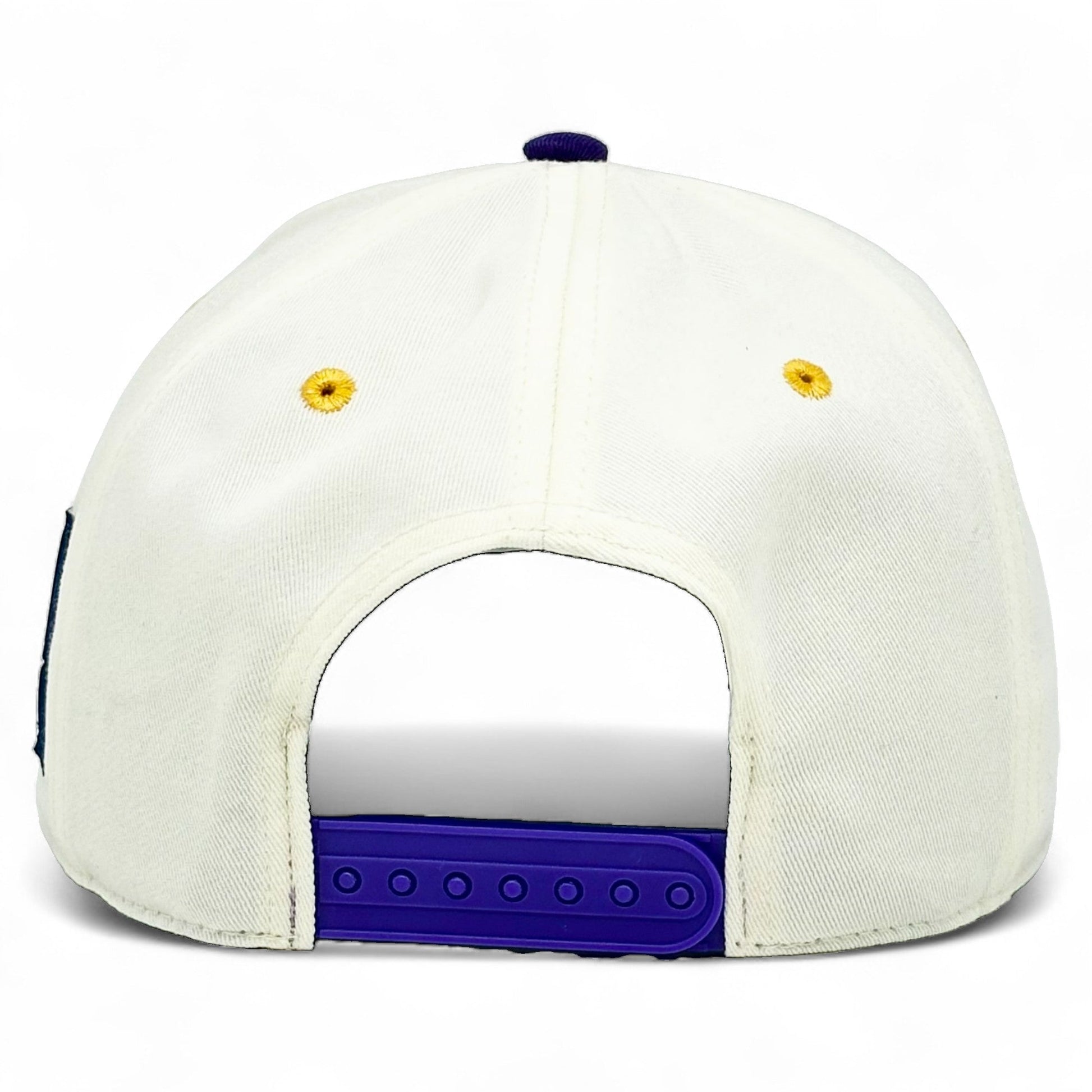 Six-panel structured build in cream and royal purple, perfect for those moments when Death Valley needs a game-changer. Each detail crafted for those who know what fearless looks like.