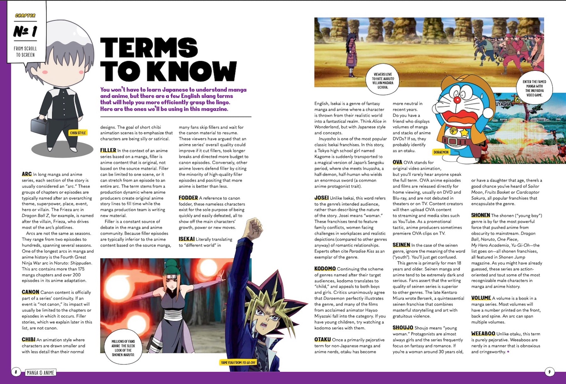 ANIME (PRONOUNCED “AH-NUH-MAY,” OR “AH-NEE-MAY” IN Japanese) is likely what you’ve heard of, but it all started with manga, the Japanese comic books. The most successful manga often become animated series, known as anime. In these pages, you’ll find everything you need to know to begin your journey into this massive medium. Uncover anime’s origins, dating back to the early 1900s, and its shared history with pioneers of comics, film and animation, including Walt Disney and Osamu Tezuka. Pick up on all the terminology, lingo, popular characters, classic series and hit franchises. And discover howthis medium has influenced other media, artists and audiences from Brazil to Boston. Art style defines anime more than anything else: Think of the big eyes, unrealistic hairstyles and distinct facial expressions. When characters duke it out, white lines often appear behind them, as if they just warped through space. A multibillion-dollar industry and one of Japan’s biggest cultural exports, the medium’s influence can be seen almost everywhere. It has created dozens of globally recognized characters, including Pikachu, Goku, Totoro and Naruto. Anime films are often found among the nominees for animation Academy Awards. And major streaming networks like Netflix, Hulu and HBO Max are heavily invested in the genre. With the ultimate primer on everything anime, you’ll go Super Saiyan in no time!