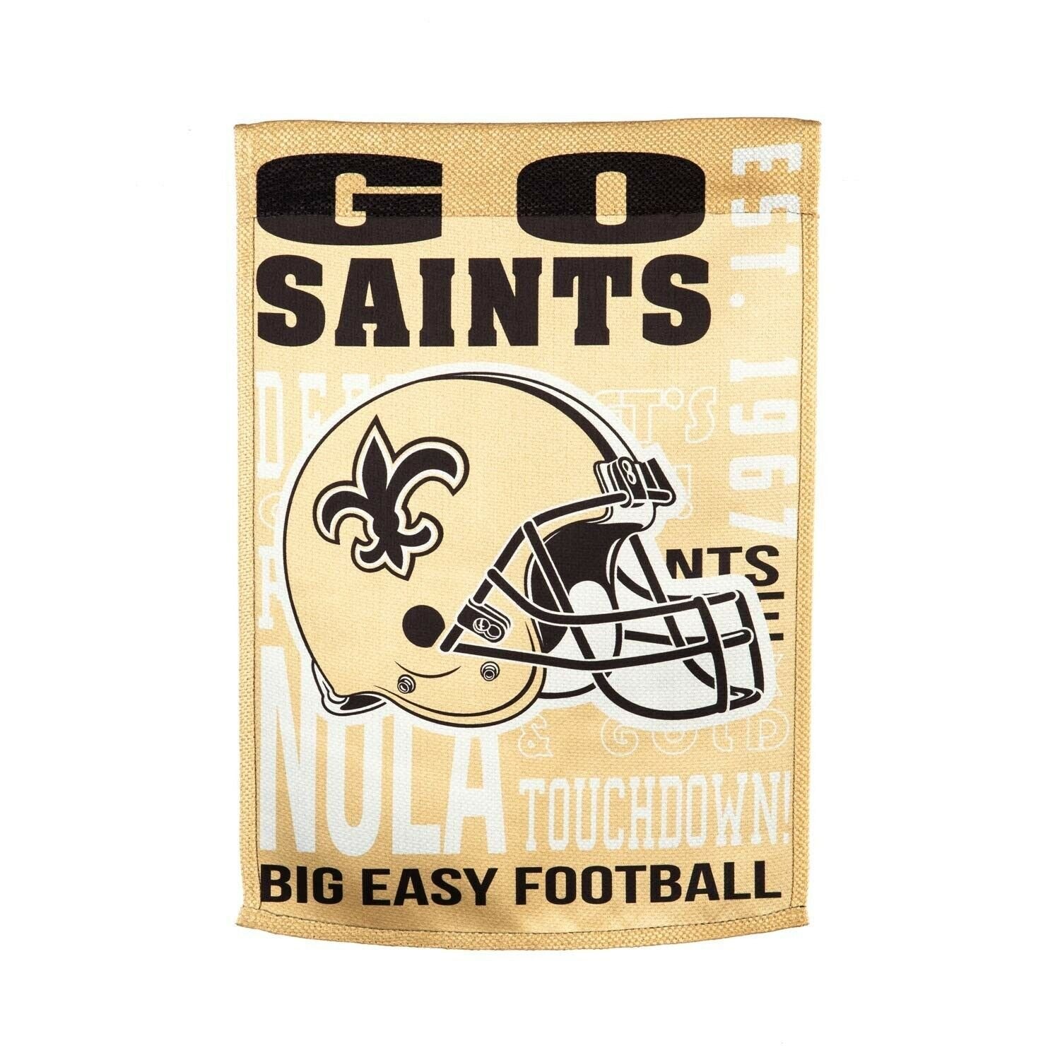 - SUPPORT YOUR TEAM IN STYLE: Show your pride loud and proud with this gorgeous double sided garden flag. New Orleans Saints fans will enjoy a black, white, and gold flag with the Saints logo embossed in the center with different designs on both sides of the flag. Various team phrases like Go Saints, NOLA, Big Easy Football, and Est. 1967 accent the flag and display your team spirit for everyone to see.
