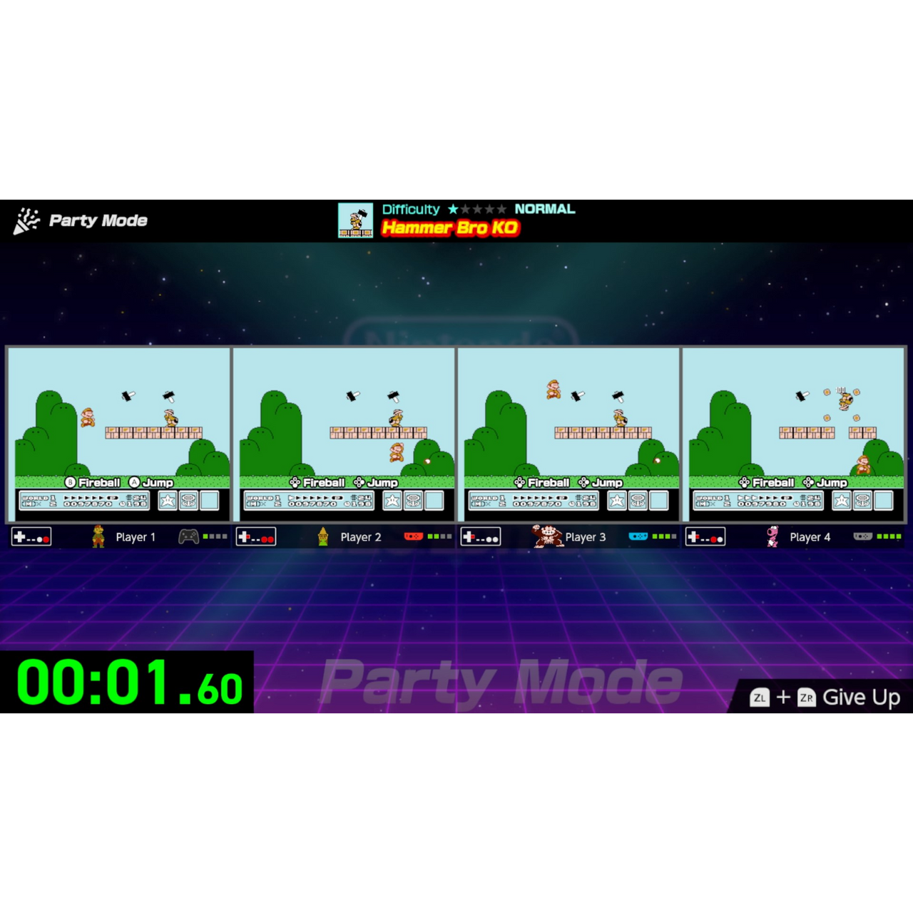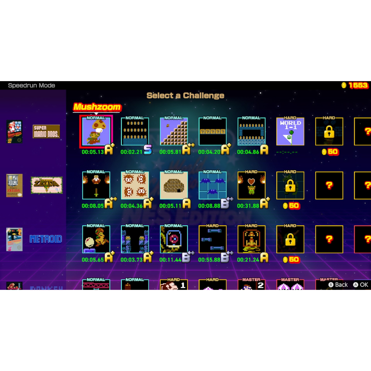 Bring the Nintendo World Championships to your living room Test your speedrunning skill in over 150 challenges! Each challenge relives a memorable moment one of 13 NES™ games*, including classics like Super Mario Bros.™ 3, The Legend of Zelda™, Donkey Kong™, and Metroid™. Start small by seeing how quickly you can blaze through the first level of Super Mario Bros. or how fast you can gobble up an enemy in Kirby’s Adventure™ *. Hone your skills in practice and see if you have what it takes to be a champion—the tougher challenges may truly test your limits! Nintendo World Championships: NES Edition is coming to the Nintendo Switch™ system on July 18. Compete against players around the world online Jump into the World Championship Mode with a Nintendo Switch Online membership** and aim for a spot on the leaderboards in five challenges that rotate each week. At the end of each week, compare your times against players of varying skill levels, or sit back and watch the world’s best time to learn how to improve. With "byte-sized" challenges, you don't need to master entire games to feel like a Nintendo World Champion! Challenge your friends on the couch Gather up to 8 players*** in the local Party Mode to take on challenges individually or in themed Challenge packs. With an automatic rewind feature to undo mistakes, even completely new players can compete. A Deluxe Set with a replica NES game cartridge and other NES themed collectibles The Nintendo World Championships: NES Edition – Deluxe Set includes a gold-colored replica cartridge and stand to commemorate the 1990 World Championships, as well as 13 art cards—one for each NES title represented in the game—and pins modeled after four in-game badges and the game logo. It also includes a physical version of the game. * NES games are not included in their entirety. ** Any Nintendo Switch Online membership (sold separately) and Nintendo Account required for online features. Membership auto-renews after initial term at the then-current price unless canceled. Not available in all countries. Internet access required for online features. Terms apply. nintendo.com/switch-online. ***Additional accessories may be required for multiplayer mode. Sold separately.