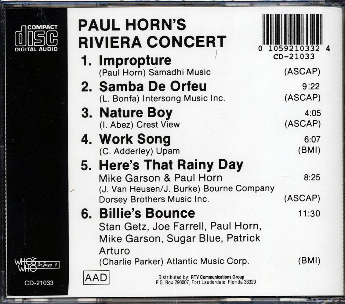 Paul Horn Paul Horn's Riviera Concert Music CD
