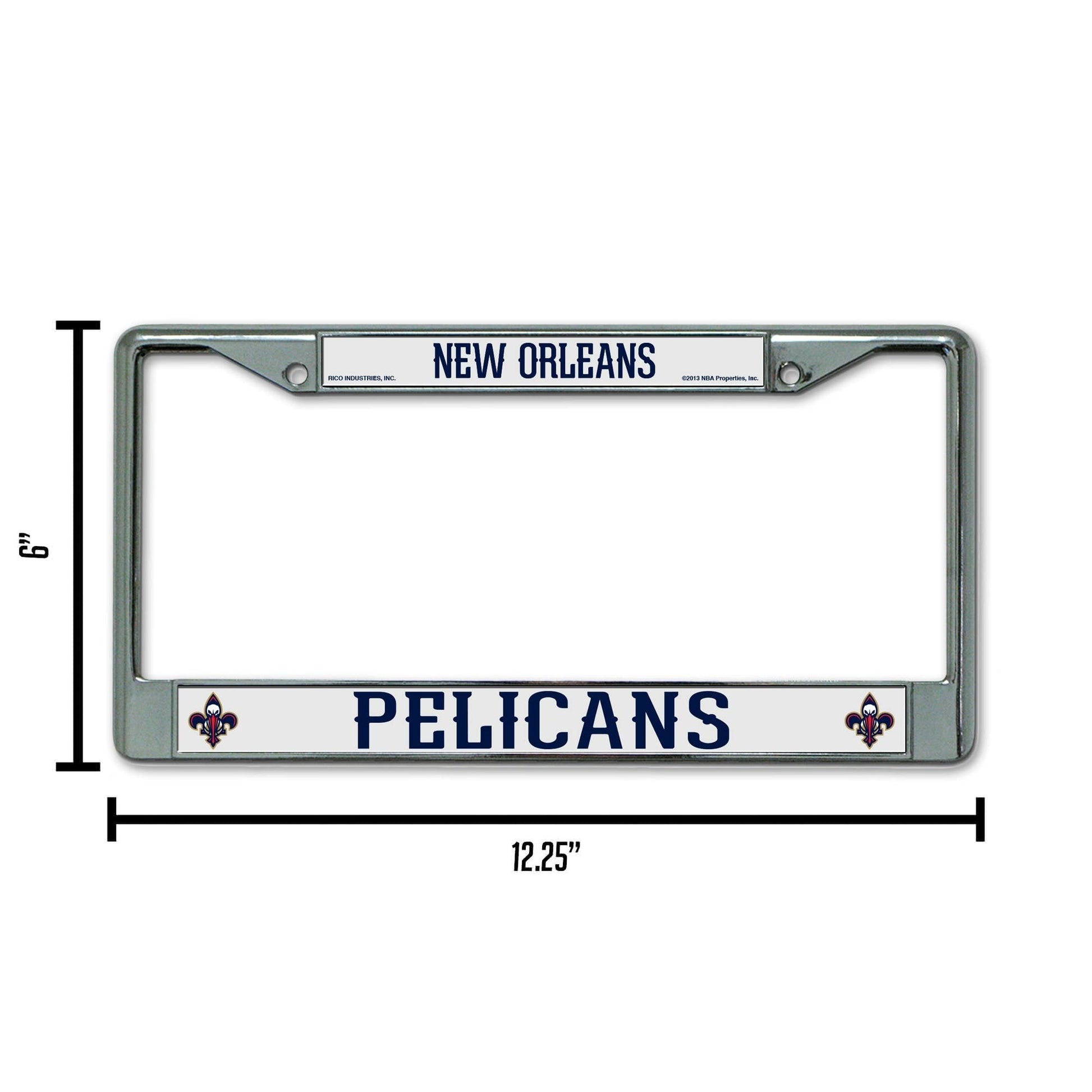 Proudly display your team spirit when you're cruising around with this Rico New Orleans Hornets chrome license plate frame. The officially licensed 6-in x 12-in frame is decorated in the team colors and designed with plastic team inserts at the top and bottom.