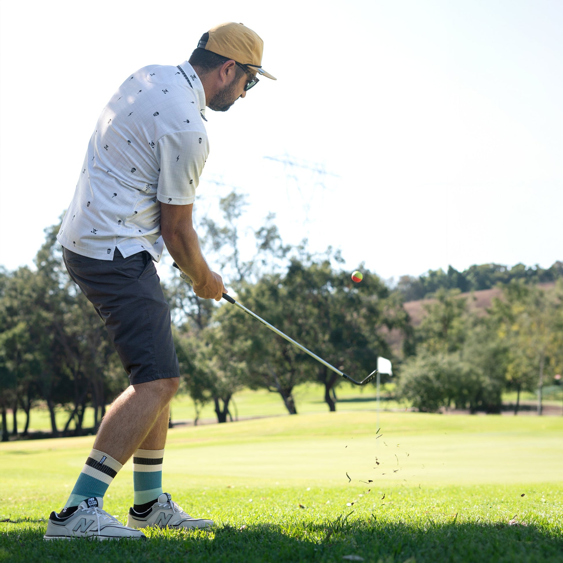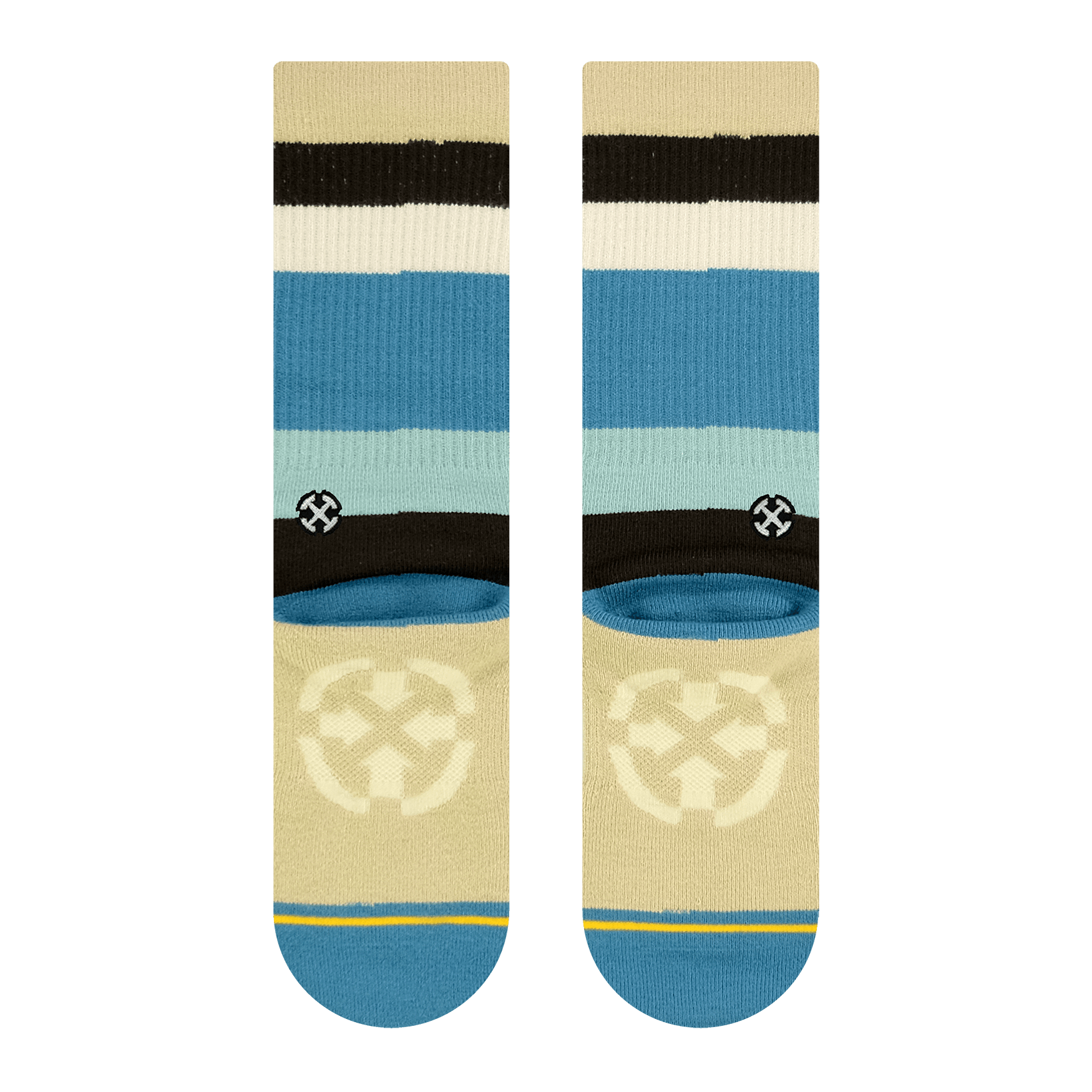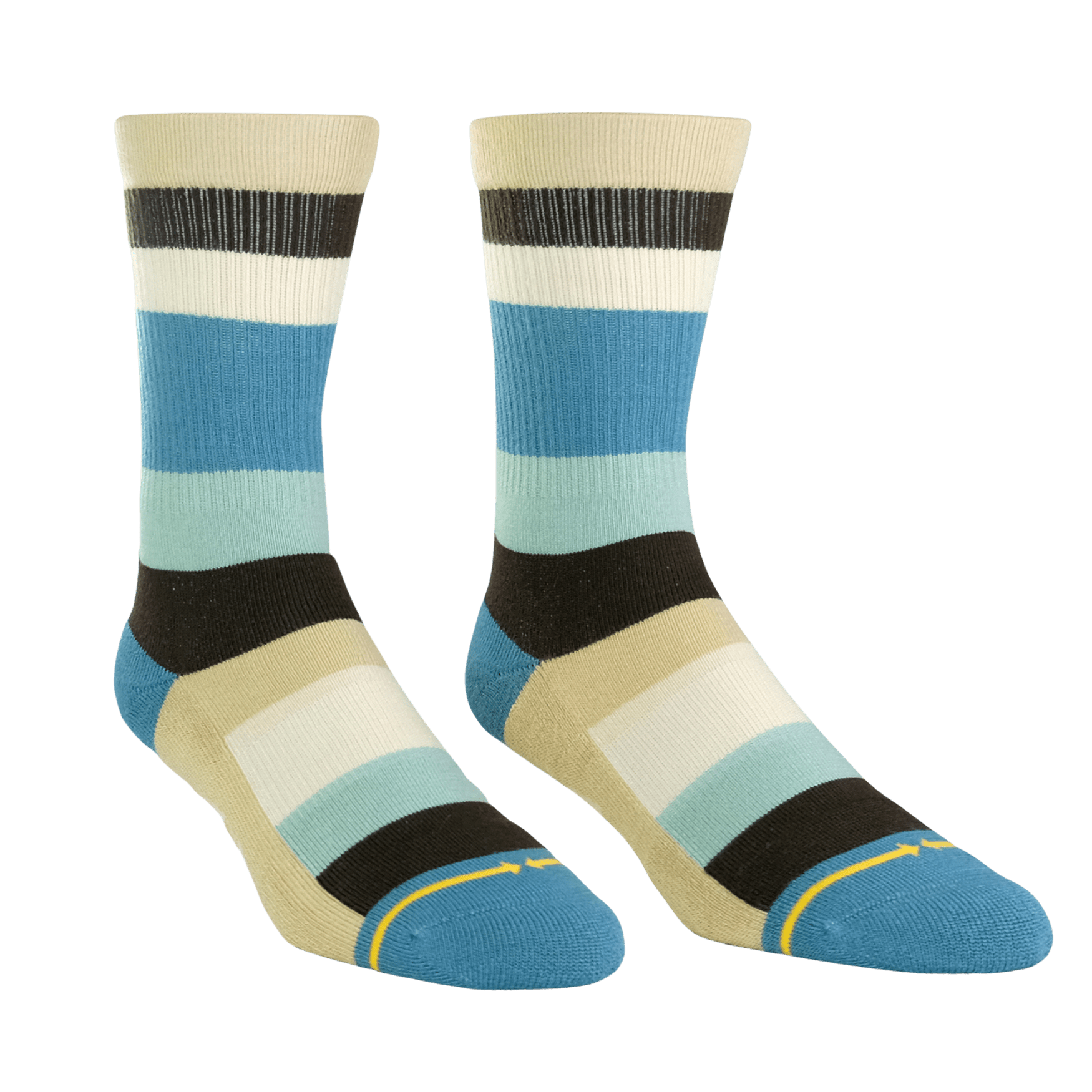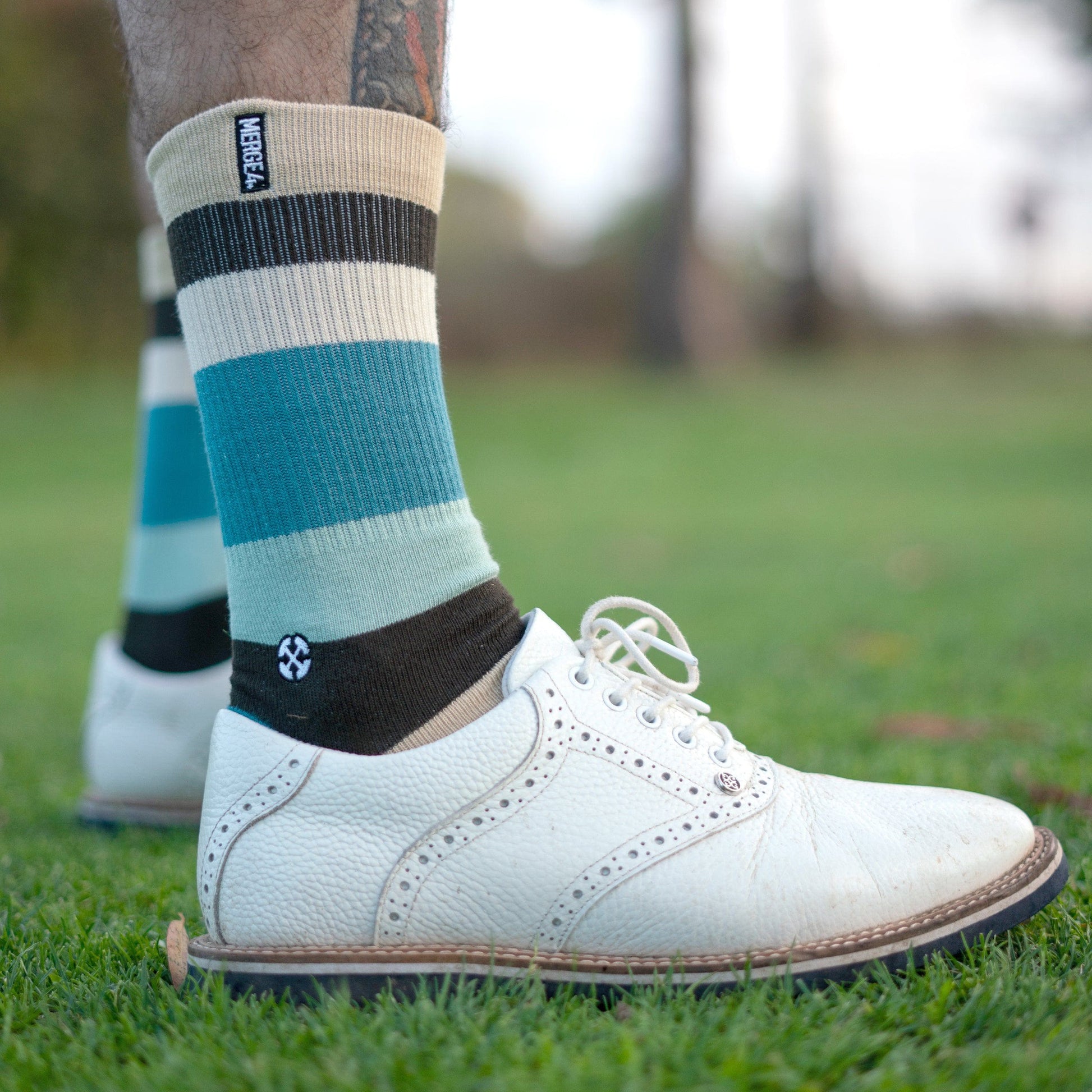 The MERGE4 sustainable sock collection offers a combination of comfort, sustainability, and performance with their mechanical bamboo material. These Spidey De Montrond inspired socks feature cool sand and ocean blue colored stripes woven in. Bamboo fibers provide moisture-wicking properties and are hypoallergenic, while also being one of the most sustainable materials on the planet. The classic design of these socks makes them versatile for any occasion.