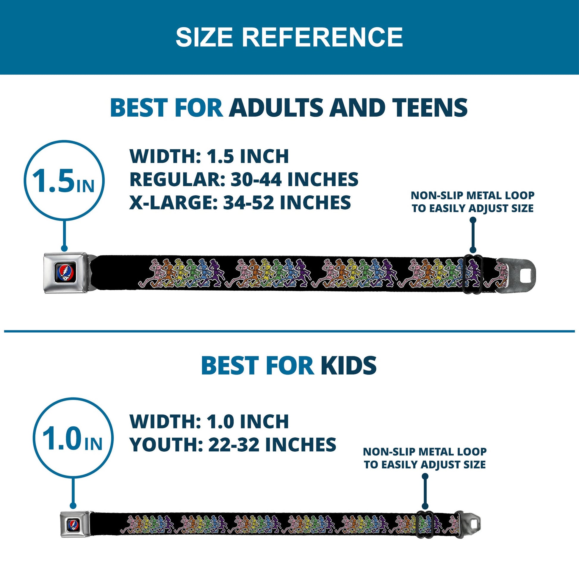 Buckle-Down's iconic Seatbelt Belt is a cool, smart, and exciting blend of fashion and function. Always a conversation starter, our Seatbelt Belt adjusts to perfectly fit your waist while showcasing your unique sense of style. Our Seatbelt Belts are made with authentic automotive style seatbelt buckles making them easy to open and close at the push of a button. Our adult-size Seatbelt Belts are 1.5 inches wide and our kid-sized Seatbelt belts are 1.0 inch wide. This product is Handcrafted in USA by Buckle-Down Inc. and officially licensed by Grateful Dead.