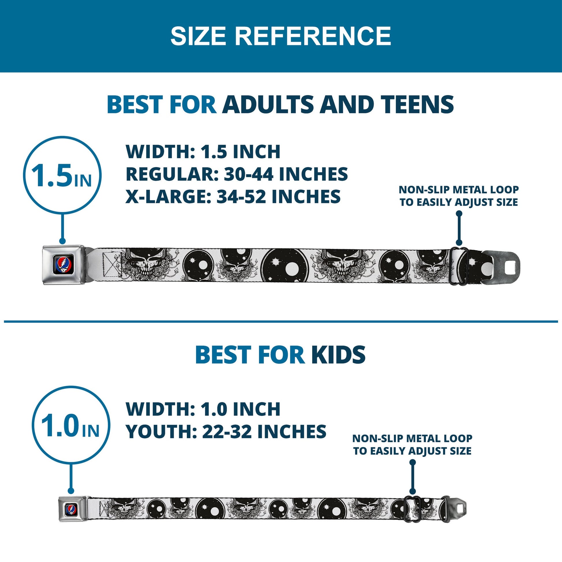 Buckle-Down's iconic Seatbelt Belt is a cool, smart, and exciting blend of fashion and function. Always a conversation starter, our Seatbelt Belt adjusts to perfectly fit your waist while showcasing your unique sense of style. Our Seatbelt Belts are made with authentic automotive style seatbelt buckles making them easy to open and close at the push of a button. Our adult-size Seatbelt Belts are 1.5 inches wide and our kid-sized Seatbelt belts are 1.0 inch wide. This product is Handcrafted in USA by Buckle-Down Inc. and officially licensed by Grateful Dead.