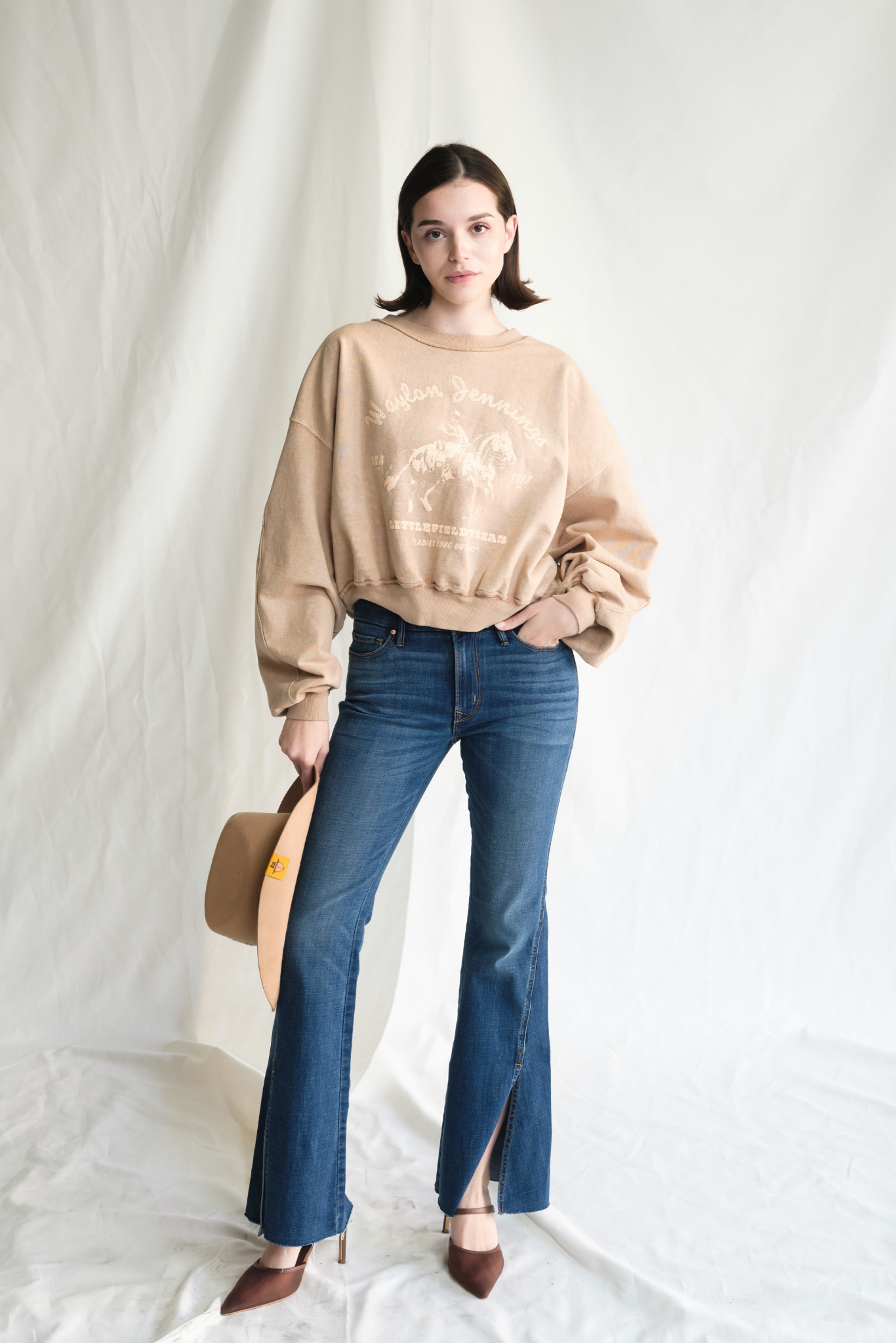 In a soft, rustic camel color, this sweatshirt is a tribute to the open road and the freedom of the outlaw way. The classic, comfortable fit is updated with a stylish cropped hem, while the ribbed neck and cuffs give it that vintage, broken-in feel.
