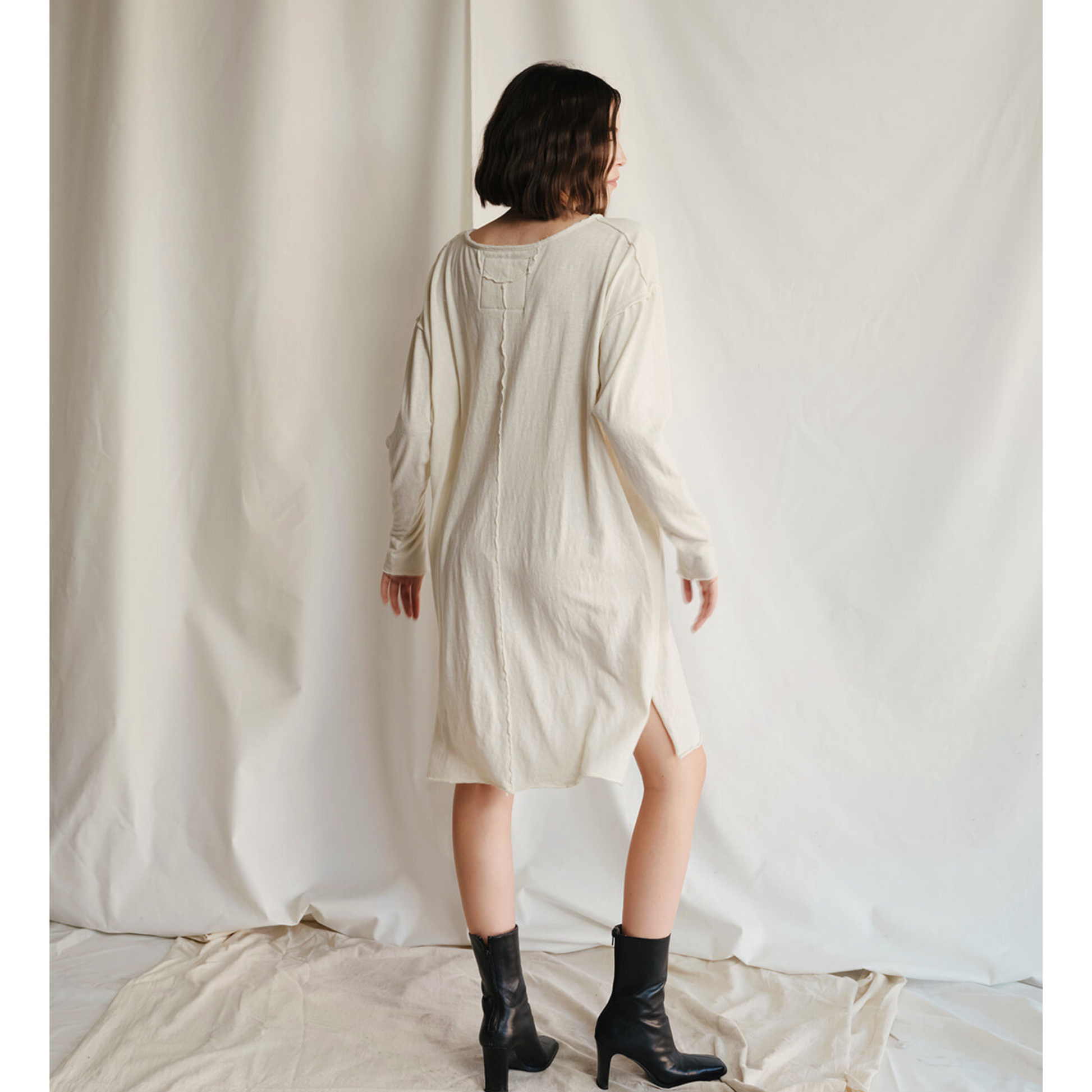 Unleash your inner renegade. This isn't just a dress; it's a statement. The raw edges whisper of rebellion, while the side slits dare to reveal. And then there's him – Willie Nelson, an icon of unapologetic authenticity, emblazoned across the soft ecru canvas of 50% recycled cotton and 50% pure cotton. Slip into this and own your outlaw spirit.