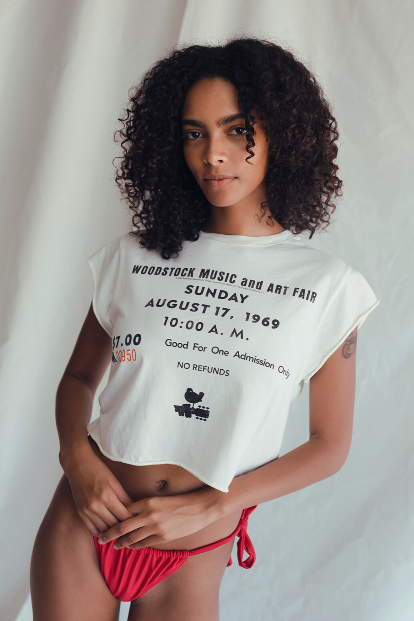 Relive the iconic Woodstock Music and Art Fair on Sunday August 17, 1969 with our Woodstock Entry Top. This crop tee is "Good For One Admission" to funky town. With a raw edge sleeve and 100% cotton, it's perfect for vintage vibes. Get ready to embrace the culture and music of a legendary festival.
